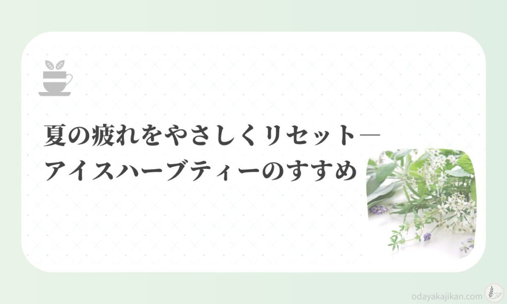 暑い夏におすすめの「アイスハーブティー」。手軽に作れる方法やおすすめブレンドで、夏の疲れをやさしくリセットしましょう。 心にやすらぎを「何もしない」を楽しむ夏 ― 心に休憩を届ける、小さな習慣