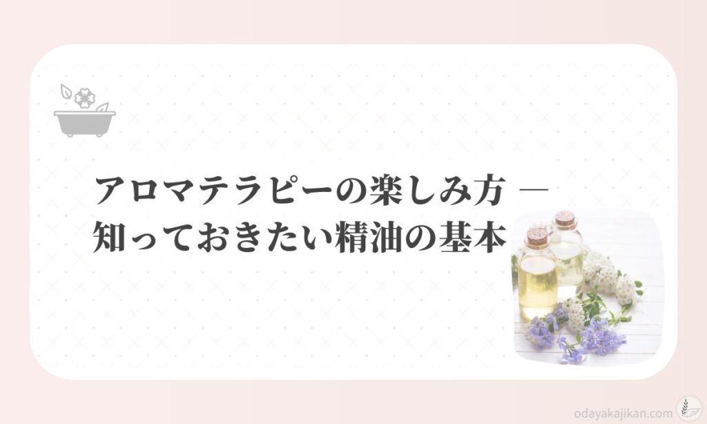 秋の夜空を楽しむ日本の伝統「お月見」。十五夜や十三夜の由来、お団子やススキに込められた意味、地域ごとの風習、現代の楽しみ方まで日本の秋を彩る文化をご紹介します。 香りとセルフケアアロマテラピーの楽しみ方 ― 知っておきたい精油の基本