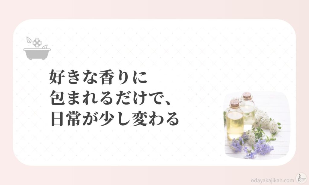 好きな香りにふれるだけで、気持ちが少しやわらぎ、安心できることがあります。香りは日常に寄り添い、心を整えてくれる小さなセルフケア。あなたらしい取り入れ方を見つけて、穏やかな時間を過ごしてみませんか。